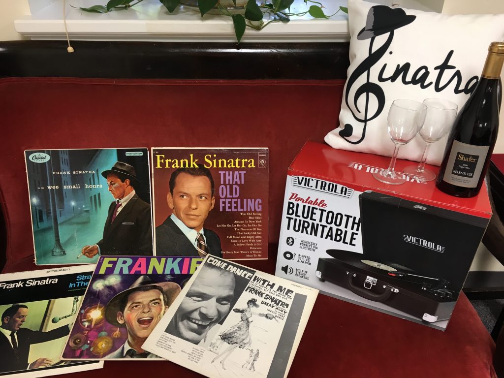 The Sinatra: a Victrola Bluetooth Turntable, five vintage Frank Sinatra albums, a Sinatra throw pillow, UPH wine glasses, and a bottle of Shafer Vineyards wine.