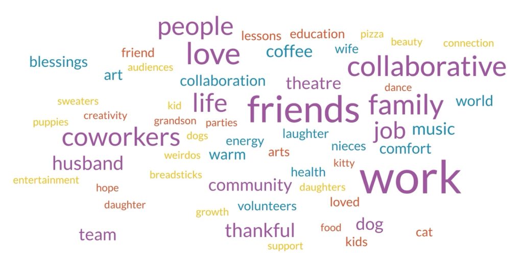 “I am grateful for having so many peers and coworkers who genuinely care about our mission, the arts, each other, and the larger community around us. Even when a day or project is frustrating or I’m feeling cynical about the world, the people at the Collaborative make me feel lucky to be working here. On top of sincerely striving to improve the Collaborative and help each other out at work, the folks here make me laugh, introduce me to new music, art, theatre, and ideas, inspire me to ask better questions, and model how to be a good human in a complex modern world.”